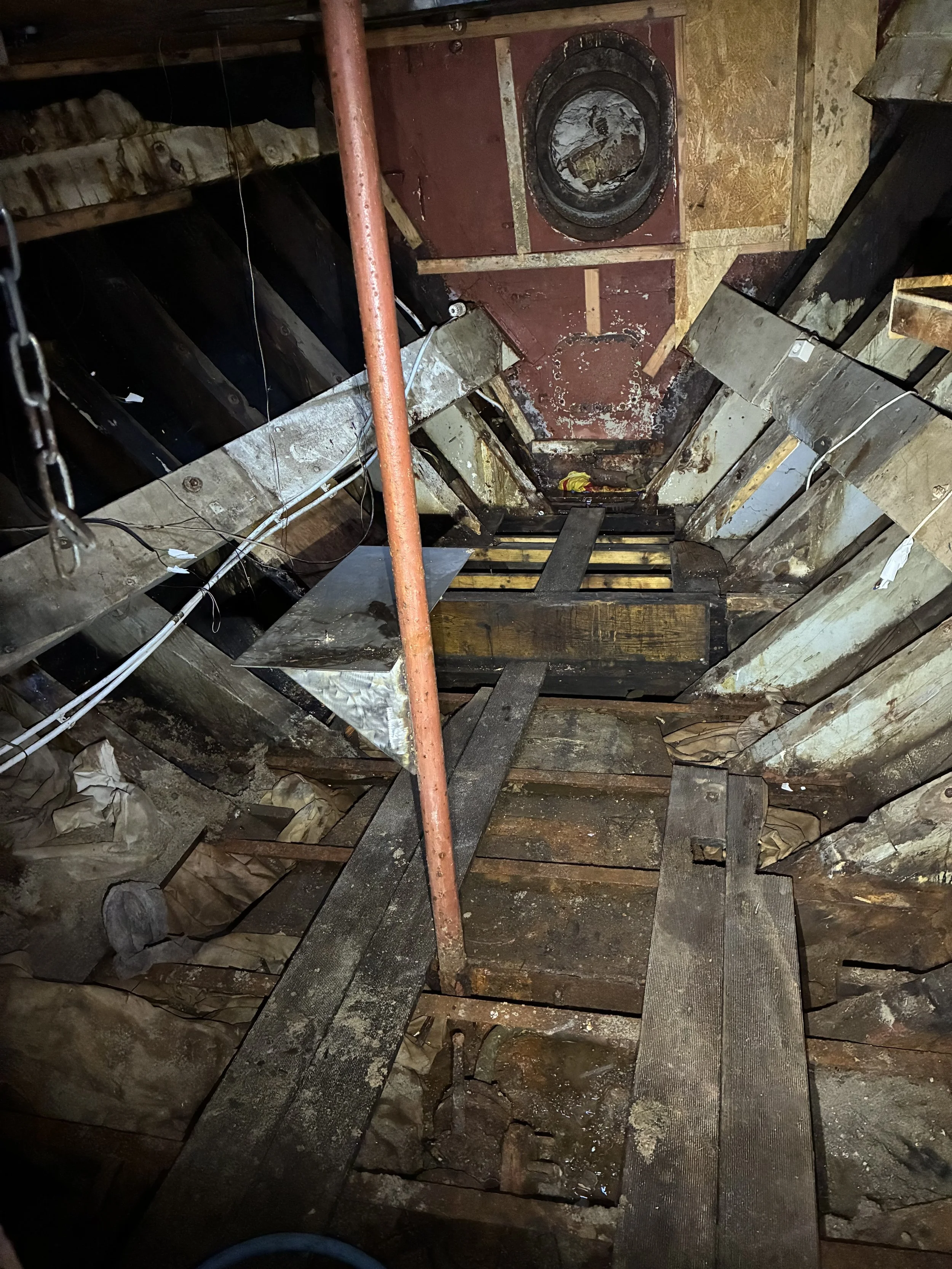Das gesamte Vorschiff war unter Deck mit Sperrholz verkleidet. Ebenfalls aus Sperrholz waren Kojen errichtet, auf denen verschimmelte Matratzen lagen. Die ganze Verkleidung war ebenfalls verschimmelt und nicht fachgerecht errichtet worden. Große Teile der Verkleidung baute ich schon zurück und arbeite an einer Reinigung des Vorschiffes.
