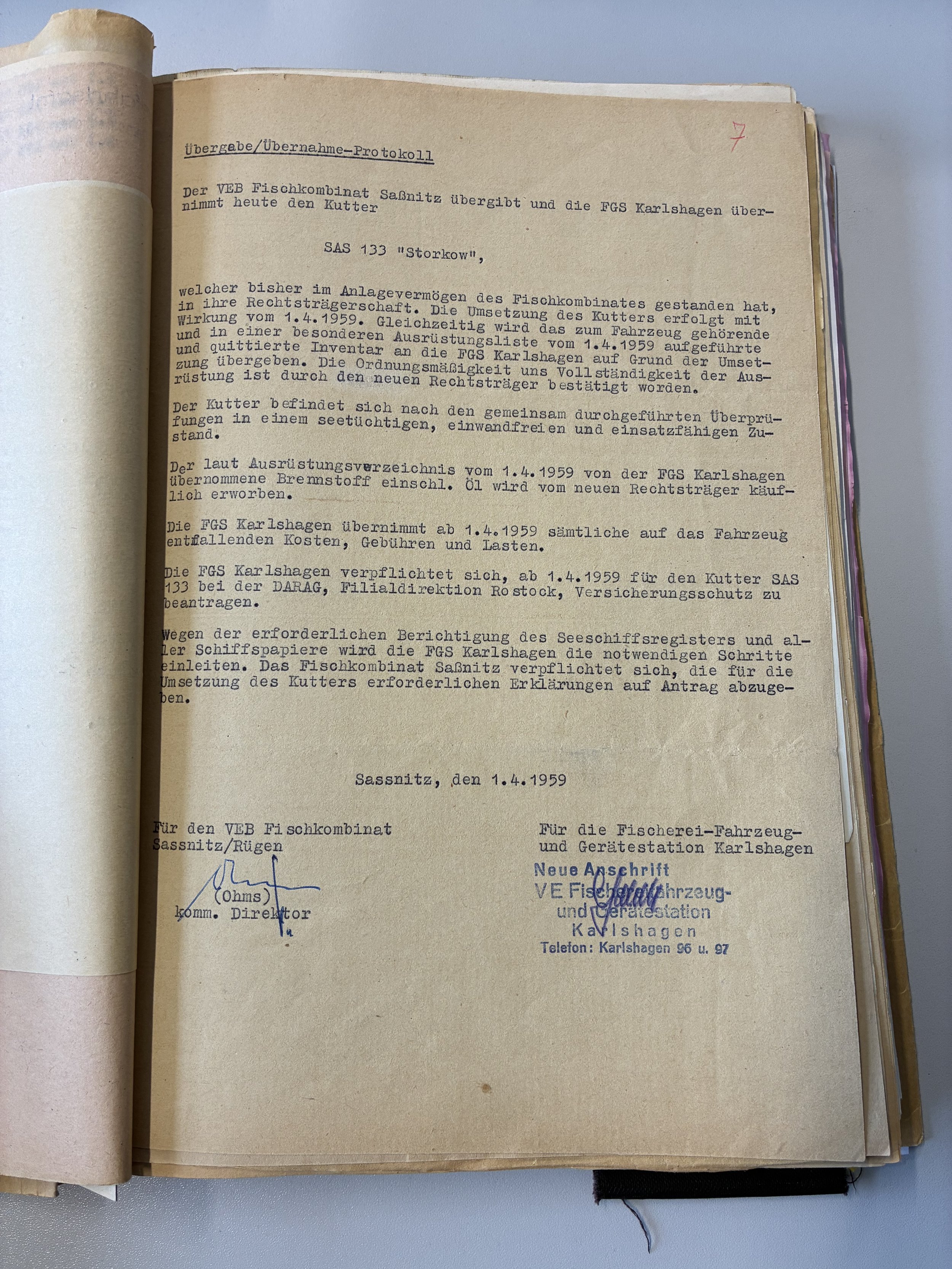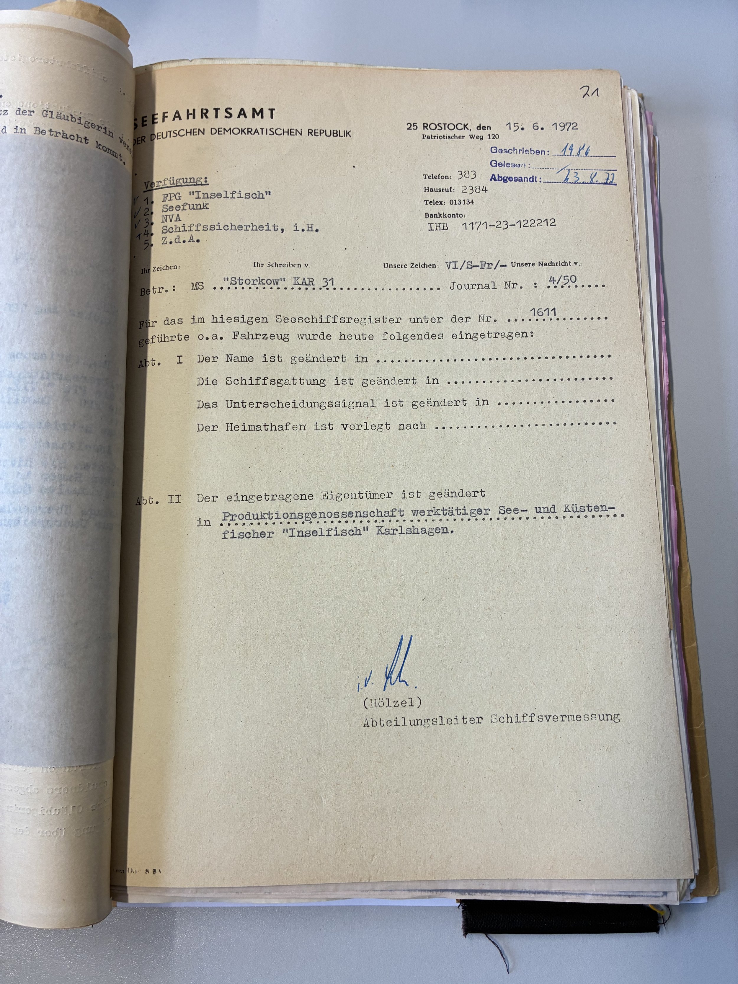 Da der Rechtsträger der Storkow nun nicht mehr die FGS in Wolgast war sondern die FPG in Karlshagen, bekam die Storkow nun das Fischereikennzeichen KARLSHAGEN 31, KAR 31.